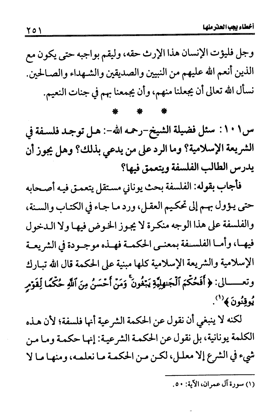 س 101: سئل فضيلة الشيخ- رحمه الله-: هل توجد فلسفة في الشريعة الإسلامية؟ وما الرد على من يدعي بذلك؟ وهل يجوز أن يدرس الطالب الفلسفة ويتعمق فيها؟