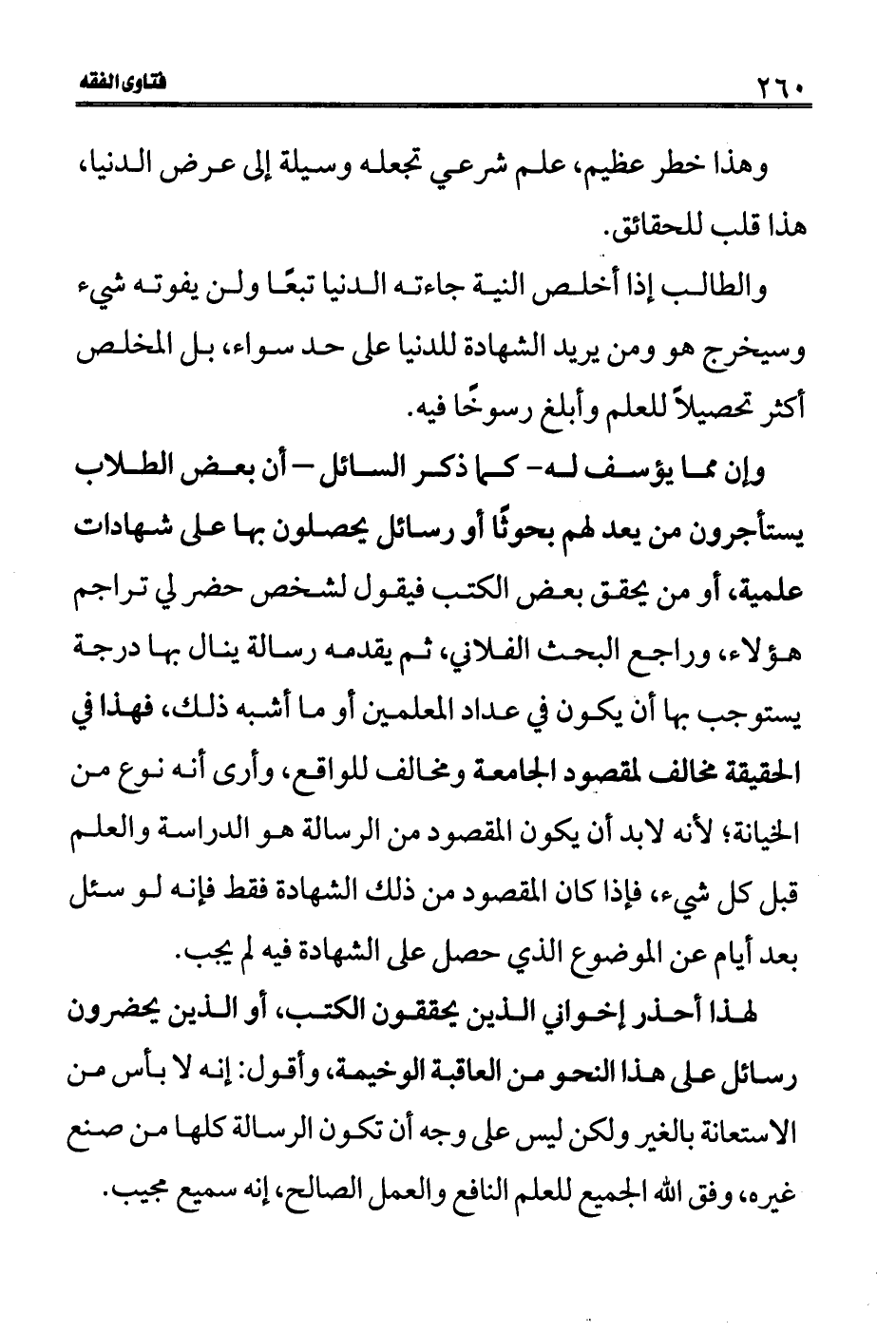 لهذا أحذر إخواني الدين يحققون الكتب، أو الذين يحضرون رسائل على هذا النحو من العاقبة الوخيمة، وأقول: إنه لا بأس من الاستعانة بالغير ولكن ليس على وجه أن تكون الرسالة كلها من صنع غيره، وفق الله الجميع للعلم النافع والعمل الصالح، إنه سميع مجيب.