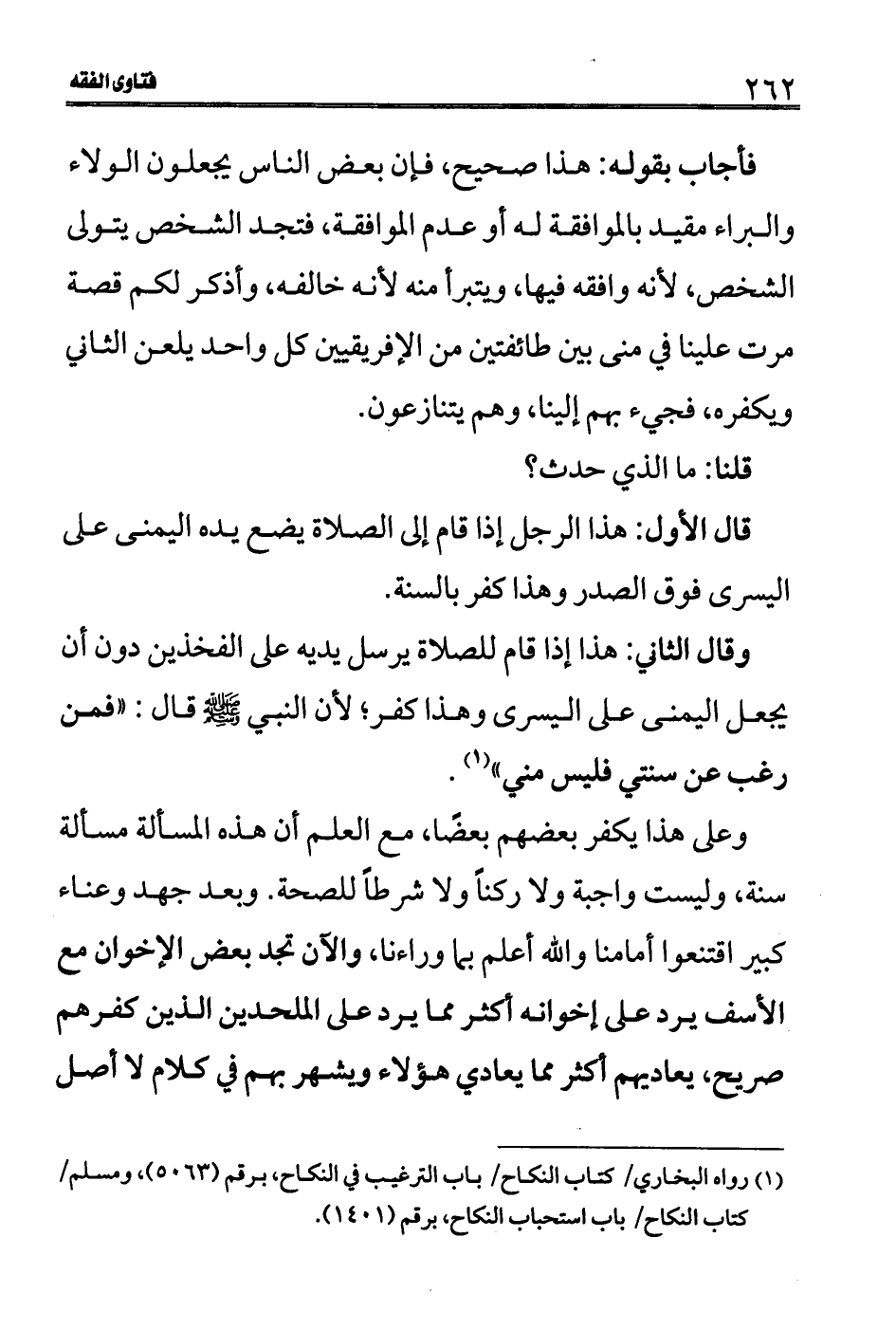 وعلى هذا يكفر بعضهم بعضًا، مع العلم أن هذه المسألة مسألة سنة، وليست واجبة ولا ركناً ولا شرطاً للصحة. وبعد جهد وعناء كبير اقتنعوا أمامنا والله أعلم بما وراءنا، والآن تجد بعض الإخوان مع الأسف يرد على إخوانه أكثر مما يرد على الملحدين الذين كفرهم صريح، يعاديهم أكثر مما يعادي هؤلاء ويشهر بهم في كلام لا أصل