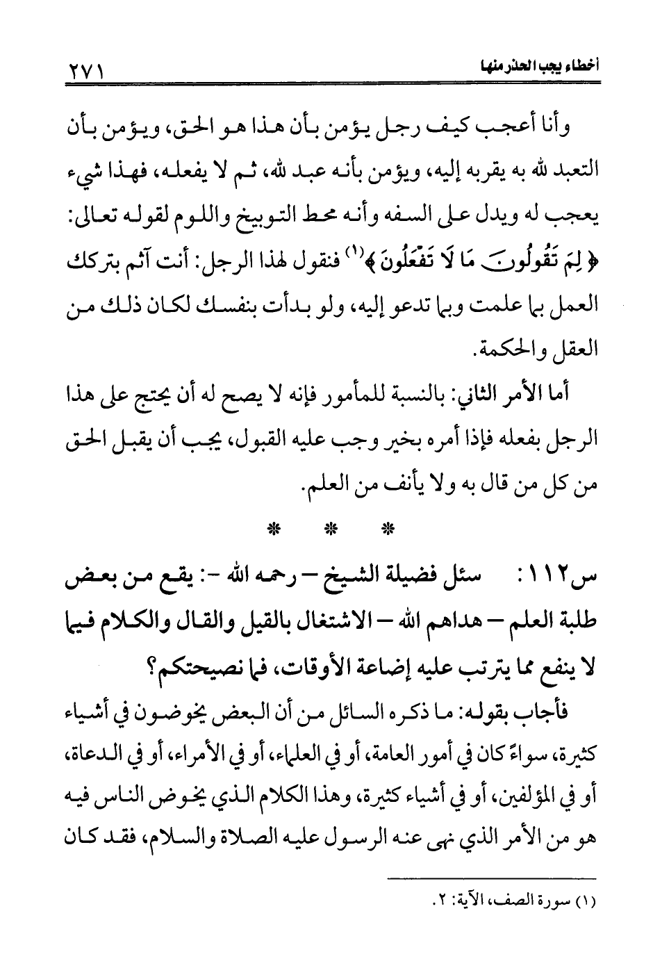 س 112: سئل فضيلة الشيخ- رحمه الله-: يقع من بعض طلبة العلم- هداهم الله- الاشتغال بالقيل والقال والكلام فيما لا ينفع مما يترتب عليه إضاعة الأوقات، فما نصيحتكم؟