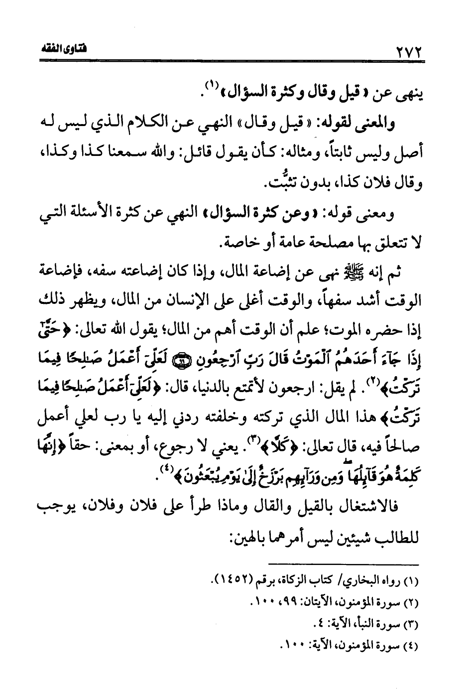 ثم إنه - صلى الله عليه وسلم - نهى عن إضاعة المال، وإذا كان إضاعته سفه، فإضاعة الوقت أشد سفهاً، والوقت أغلى على الإنسان من المال، ويظهر ذلك إذا حضره الموت؛ علم أن الوقت أهم من المال؛ يقول الله تعالى: (حَتَّى إِذَا جَاءَ أَحَدَهُمُ الْمَوْتُ قَالَ رَبِّ ارْجِعُونِ (99) لَعَلِّي أَعْمَلُ صَالِحًا فِيمَا تَرَكْتُ) (2) . لم يقل: ارجعون لأتمتع بالدنيا، قال: (لَعَلِّي أَعْمَلُ صَالِحًا فِيمَا تَرَكْتُ) هذا المال الذي تركته وخلفته ردني إليه يا رب لعلي أعمل صالحاً فيه، قال تعالى: (كَلاَّ) . يعني لا رجوع، أو بمعنى: (إِنَّهَا كَلِمَةٌ هُوَ قَائِلُهَا وَمِنْ وَرَائِهِمْ بَرْزَخٌ إِلَى يَوْمِ يُبْعَثُونَ) (4) .