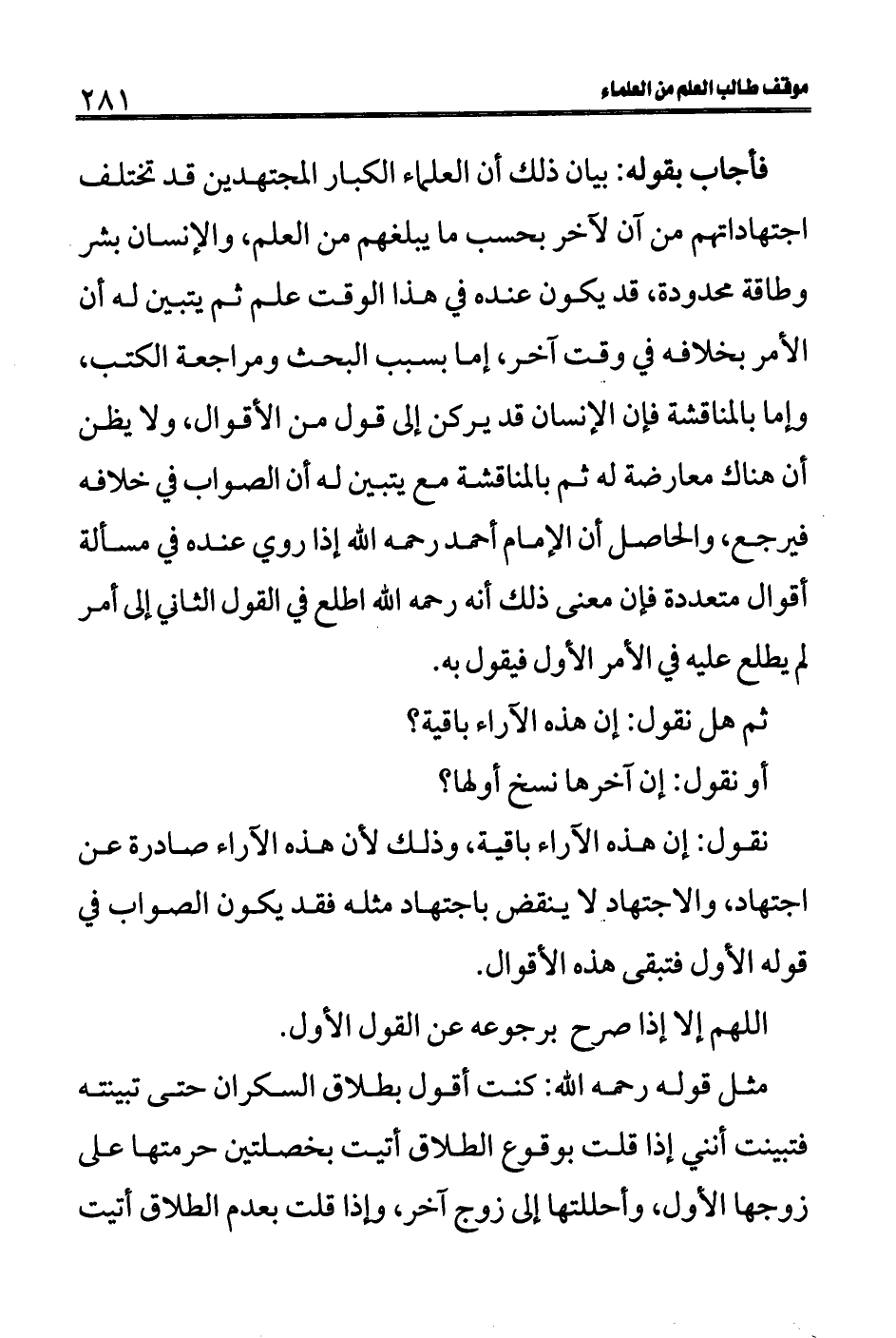 مثل قوله رحمه الله: كنت أقول بطلاق السكران حتى تبينته فتبينت أنني إذا قلت بوقوع الطلاق أتيت بخصلتين حرمتها على زوجها الأول، وأحللتها إلى زوج آخر، وإذا قلت بعدم الطلاق أتيت