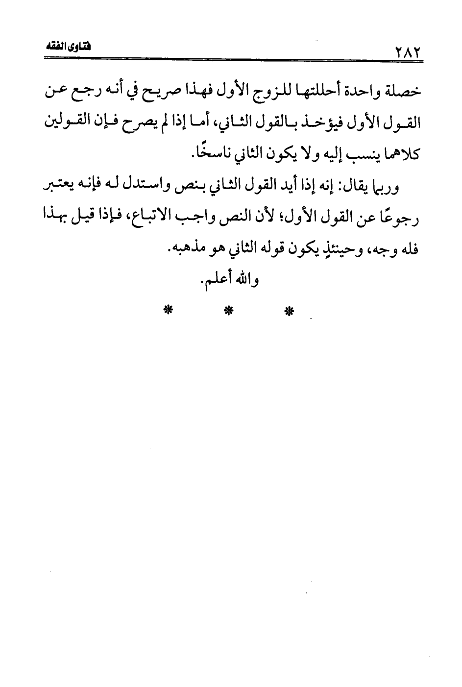 خصلة واحدة أحللتها للزوج الأول فهذا صريح في أنه رجع عن القول الأول فيؤخذ بالقول الثاني، أما إذا لم يصرح فإن القولين كلاهما ينسب إليه ولا يكون الثاني ناسخًا.