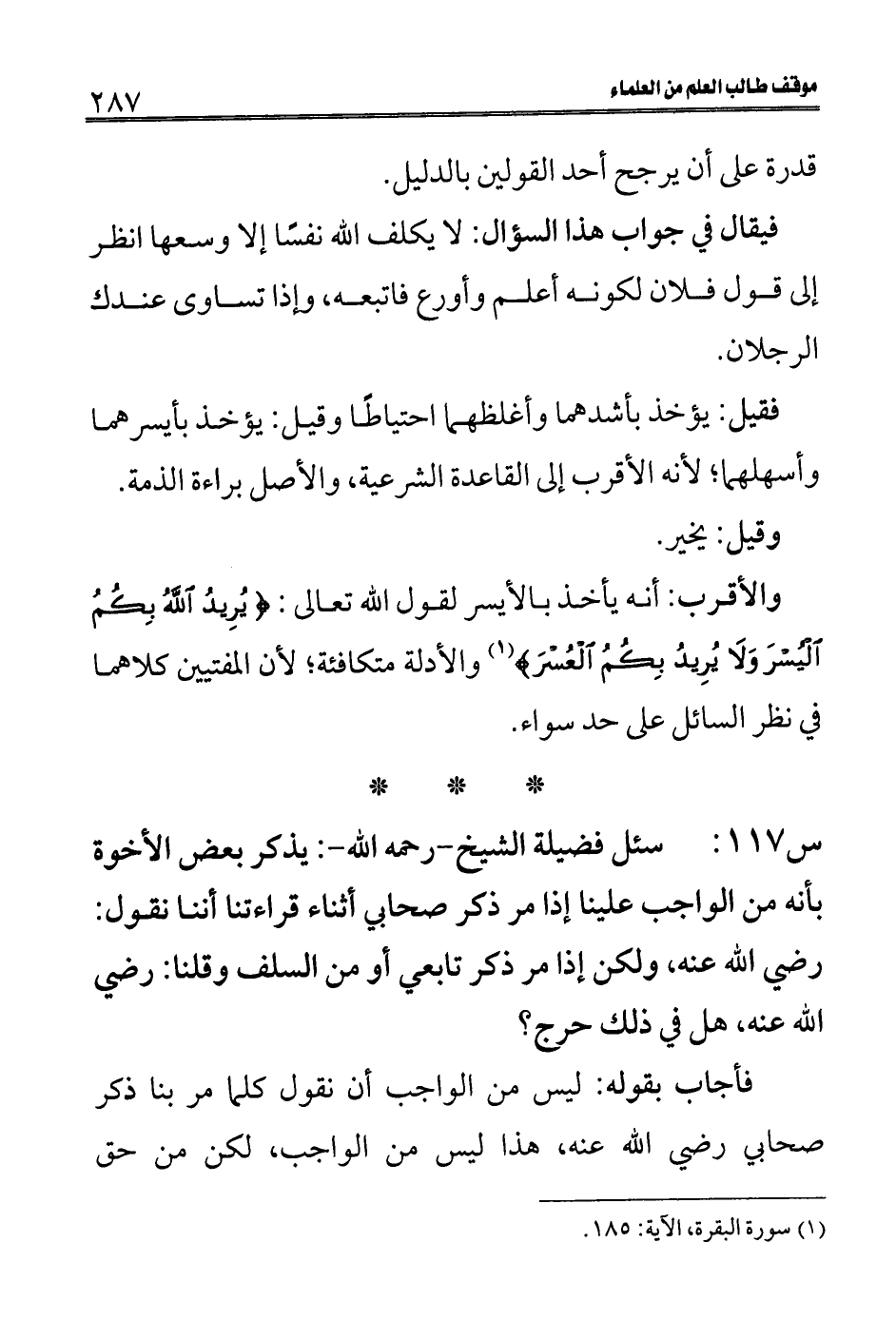 س 117: سئل فضيلة الشيخ- رحمه الله-: يذكر بعض الأخوة بأنه من الواجب علينا إذا مر ذكر صحابي أثناء قراءتنا أننا نقول: رضي الله عنه، ولكن إذا مر ذكر تابعي أو من السلف وقلنا: رضي
