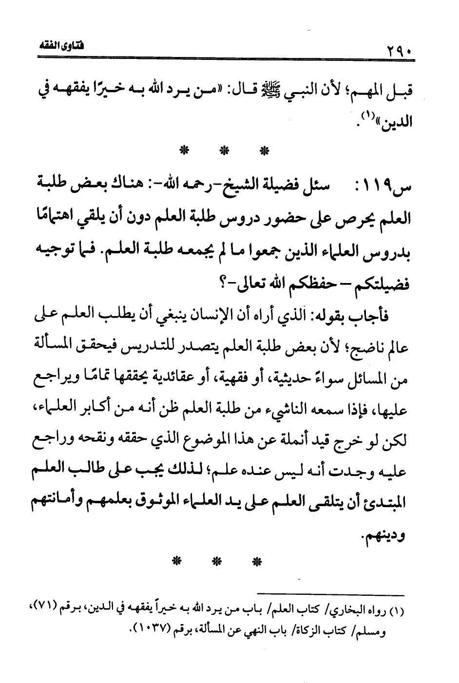 س 119: سئل فضيلة الشيخ- رحمه الله-: هناك بعض طلبة العلم يحرص على حضور دروس طلبة العلم دون أن يلقي اهتمامًا بدروس العلماء الذين جمعوا ما لم يجمعه طلبة العلم. فما توجيه