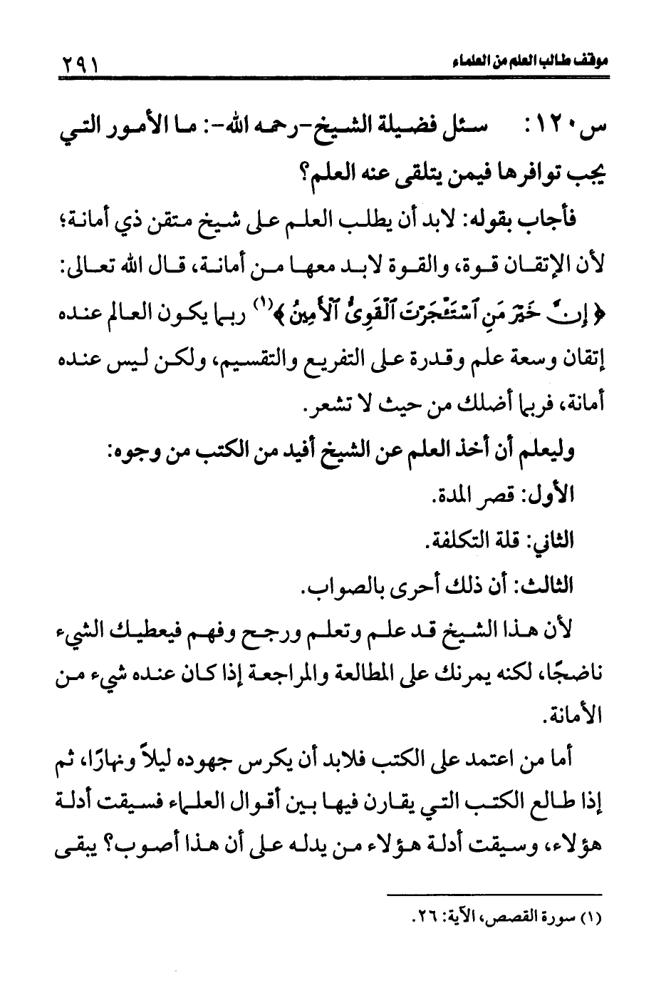 س 120: سئل فضيلة الشيخ- رحمه الله-: ما الأمور التي يجب توافرها فيمن يتلقى عنه العلم؟