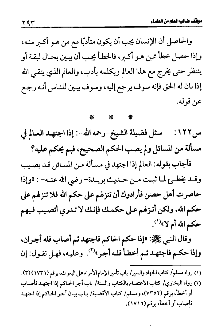 س 122: سئل فضيلة الشيخ- رحمه الله-: إذا اجتهد العالم في مسألة من المسائل ولم يصب الحكم الصحيح، فبم يحكم عليه؟