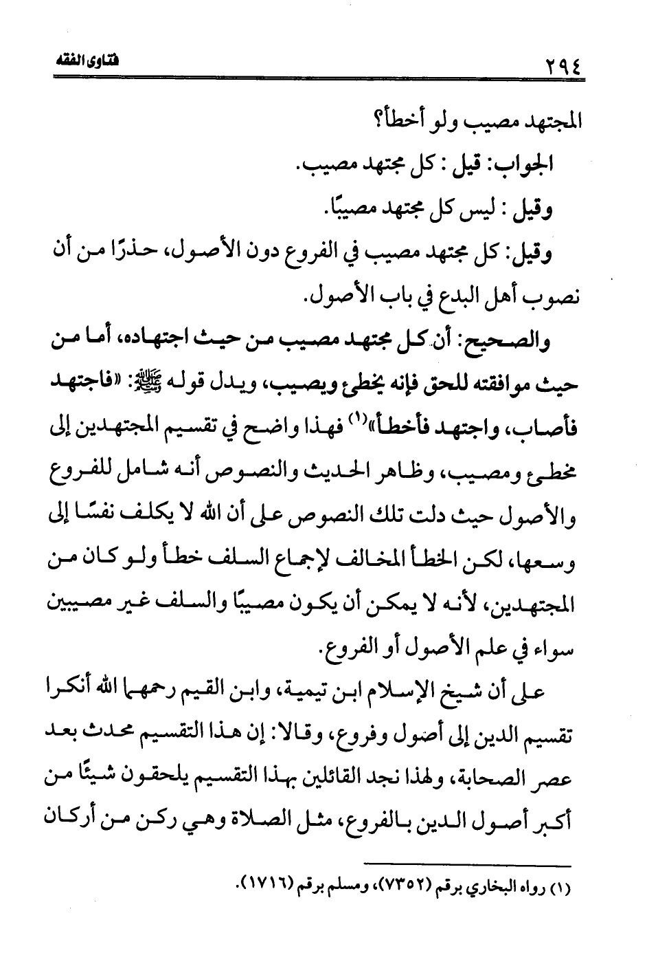 والصحيح: أن كل مجتهد مصيب من حيث اجتهاده، أما من حيث موافقته للحق فإنه يخطئ ويصيب، ويدل قوله - صلى الله عليه وسلم -: " فاجتهد فأصاب، واجتهد فأخطا" (1) فهذا واضح في تقسيم المجتهدين إلى مخطئ ومصيب، وظاهر الحديث والنصوص أنه شامل للفروع