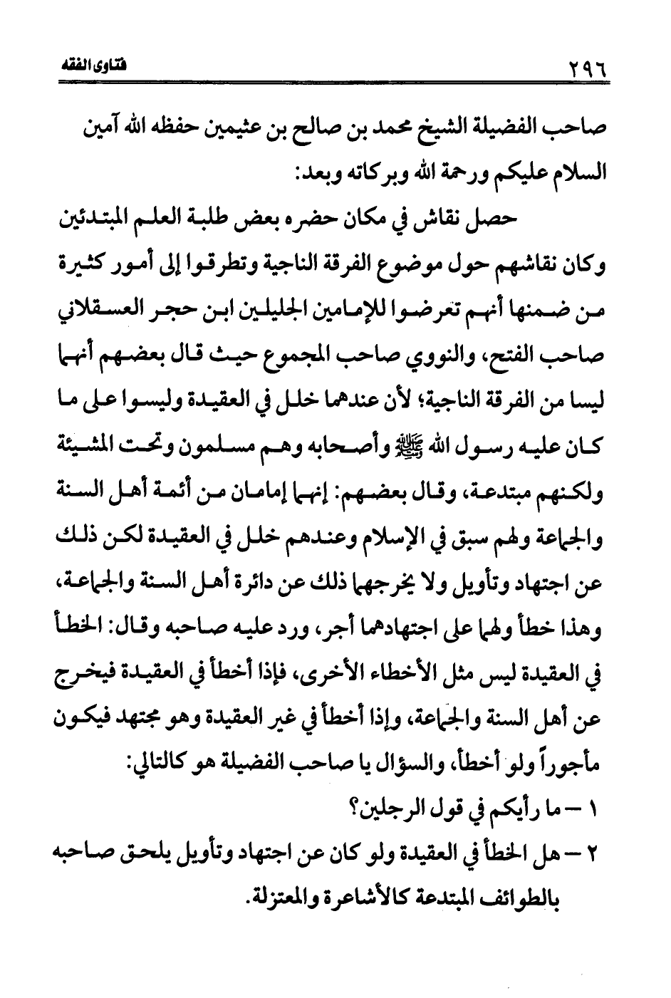 والجماعة ولهم سبق في الإسلام وعندهم خلل في العقيدة لكن ذلك عن اجتهاد وتأويل ولا يخرجهما ذلك عن دائرة أهل السنة والجماعة، وهذا خطأ ولهما على اجتهادهما أجر، ورد عليه صاحبه وقال: الخطأ في العقيدة ليس مثل الأخطاء الأخرى، فإذا أخطأ في العقيدة فيخرج عن أهل السنة والجماعة، وإذا أخطأ في غير العقيدة وهو مجتهد فيكون مأجوراً ولو أخطأ، والسؤال يا صاحب الفضيلة هو كالتالي: