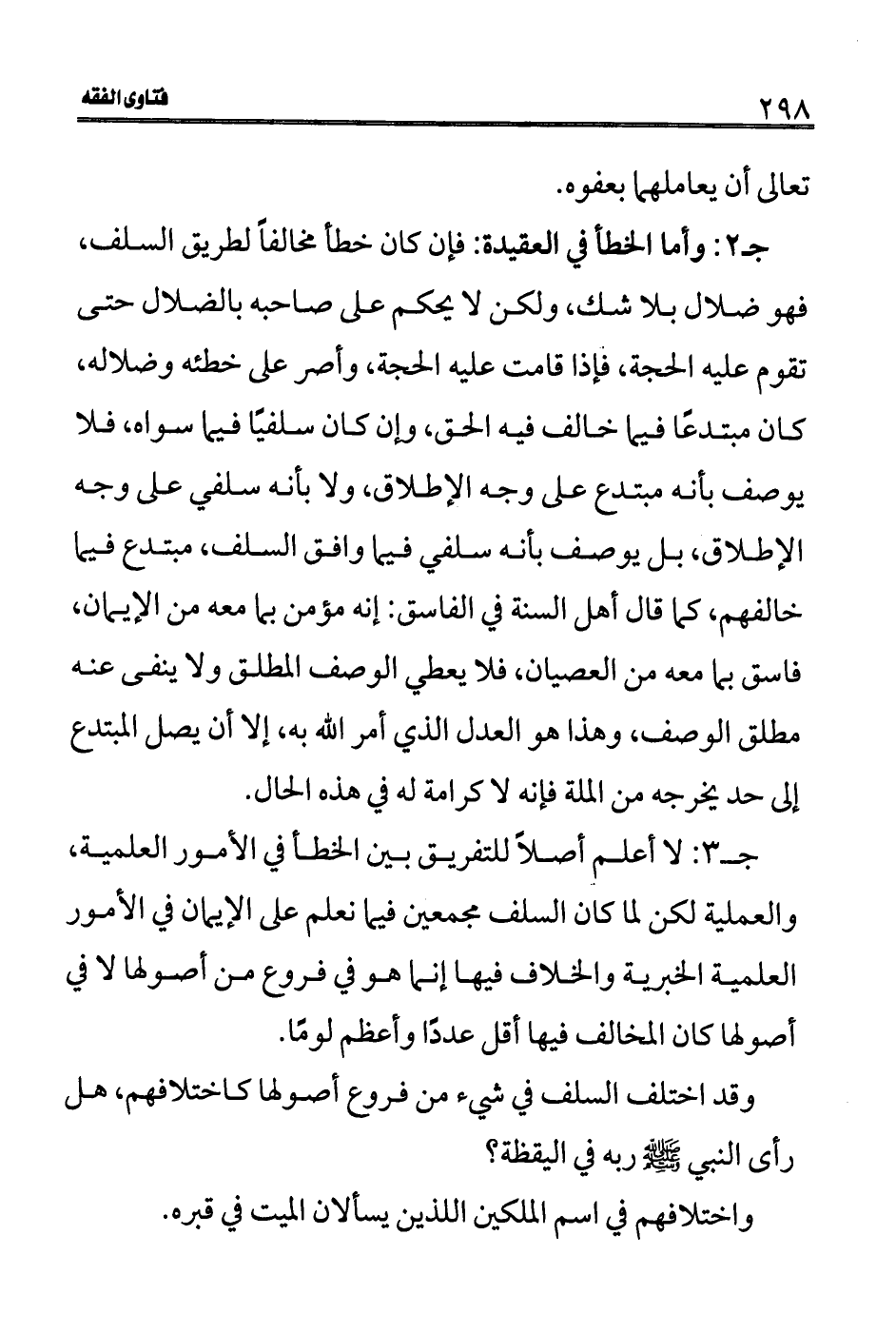 جـ3: لا أعلم أصلاً للتفريق بين الخطأ في الأمور العلمية، والعملية لكن لما كان السلف مجمعين فيما نعلم على الإيمان في الأمور العلمية الخبرية والخلاف فيها إنما هو في فروع من أصولها لا في