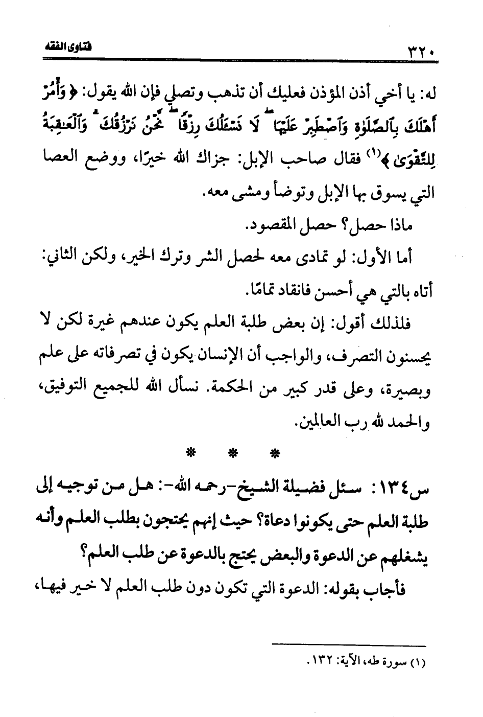 س 134: سئل فضيلة الشيخ- رحمه الله-: هل من توجيه إلى طلبة العلم حتى يكونوا دعاة؟ حيث إنهم يحتجون بطلب العلم وأنه يشغلهم عن الدعوة والبعض يحتج بالدعوة عن طلب العلم؟