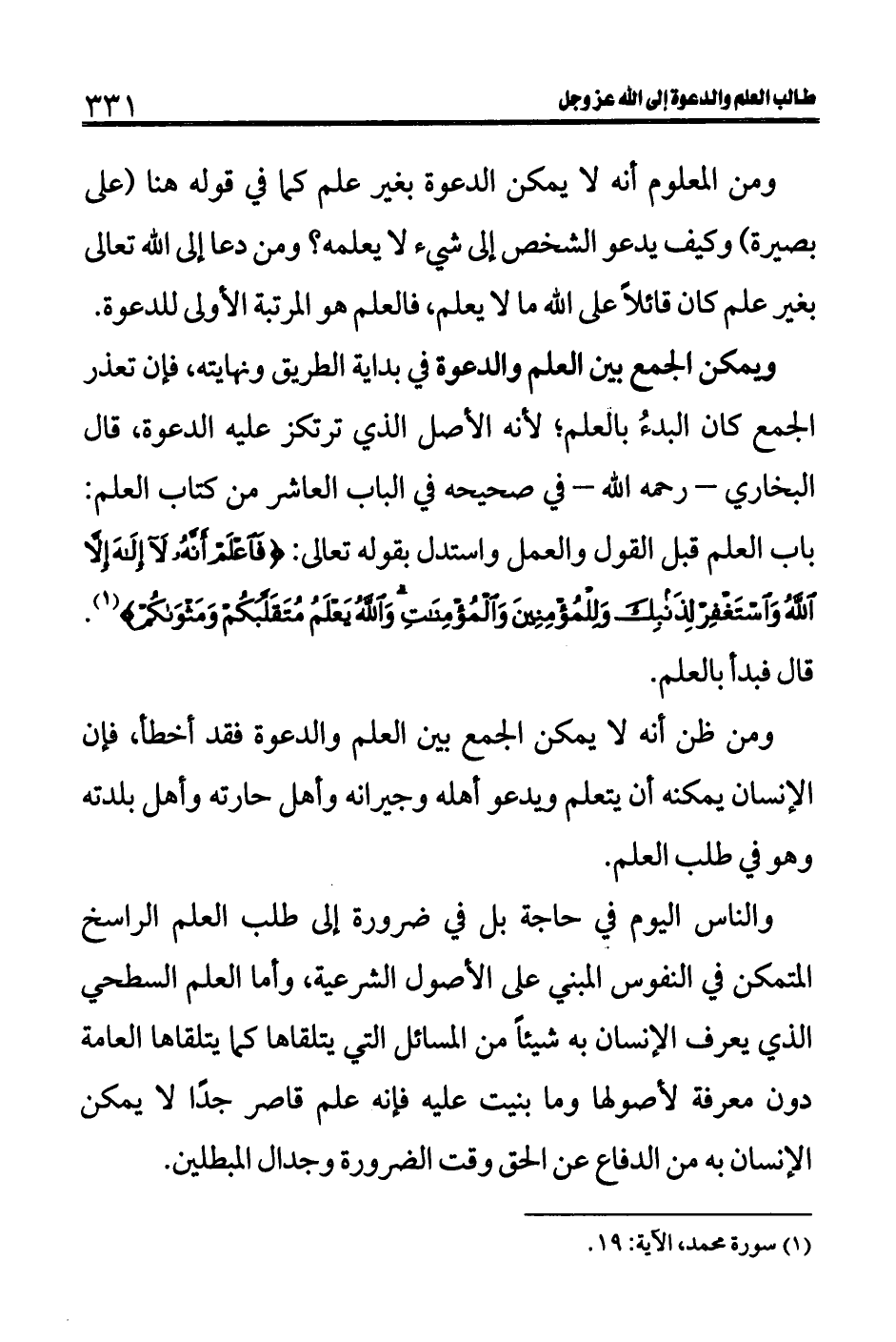 ويمكن الجمع بين العلم والدعوة في بداية الطريق ونهايته، فإن تعذر الجمع كان البدءُ بالعلم؛ لأنه الأصل الذي ترتكز عليه الدعوة، قال البخاري- رحمه الله- في صحيحه في الباب العاشر من كتاب العلم: باب العلم قبل القول والعمل واستدل بقوله تعالى: (فَاعْلَمْ أَنَّهُ لَا إِلَهَ إِلَّا اللَّهُ وَاسْتَغْفِرْ لِذَنْبِكَ وَلِلْمُؤْمِنِينَ وَالْمُؤْمِنَاتِ وَاللَّهُ يَعْلَمُ مُتَقَلَّبَكُمْ وَمَثْوَاكُمْ) (1) .