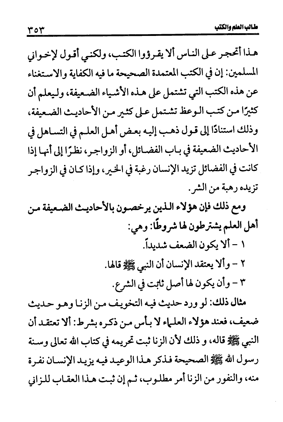 هذا أتحجر على الناس ألا يقرؤوا الكتب، ولكني أقول لإخواني المسلمين: إن في الكتب المعتمدة الصحيحة ما فيه الكفاية والاستغناء عن هذه الكتب التي تشتمل على هذه الأشياء الضعيفة، وليعلم أن كثيرًا من كتب الوعظ تشتمل على كثير من الأحاديث الضعيفة، وذلك استنادًا إلى قول ذهب إليه بعض أهل العلم في التساهل في الأحاديث الضعيفة في باب الفضائل، أو الزواجر، نظرًا إلى أنها إذا كانت في الفضائل تزيد الإنسان رغبة في الخير، وإذا كان في الزواجر تزيده رهبة من الشر.