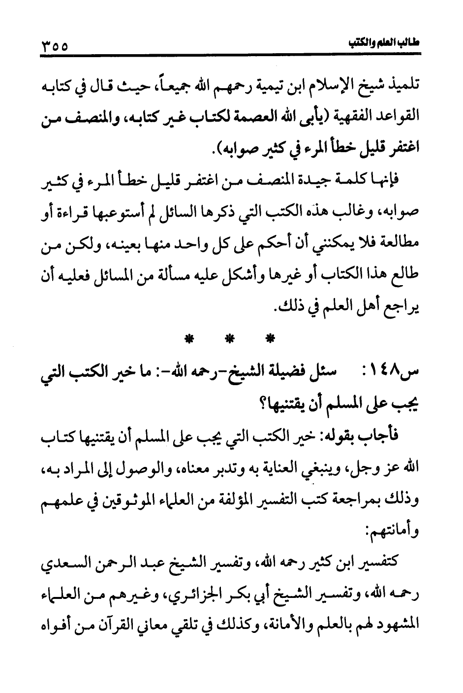 س 148: سئل فضيلة الشيخ- رحمه الله-: ما خير الكتب التي يجب على المسلم أن يقتنيها؟
