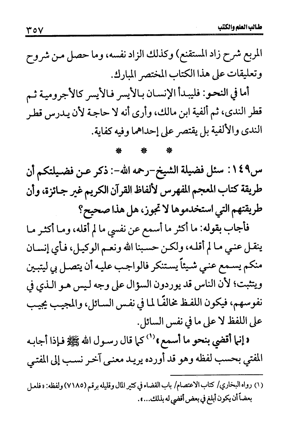 س 149: سئل فضيلة الشيخ- رحمه الله-: ذكر عن فضيلتكم أن طريقة كتاب المعجم المفهرس لألفاظ القرآن الكريم غير جائزة، وأن طريقتهم التي استخدموها لا تجوز، هل هذا صحيح؟
