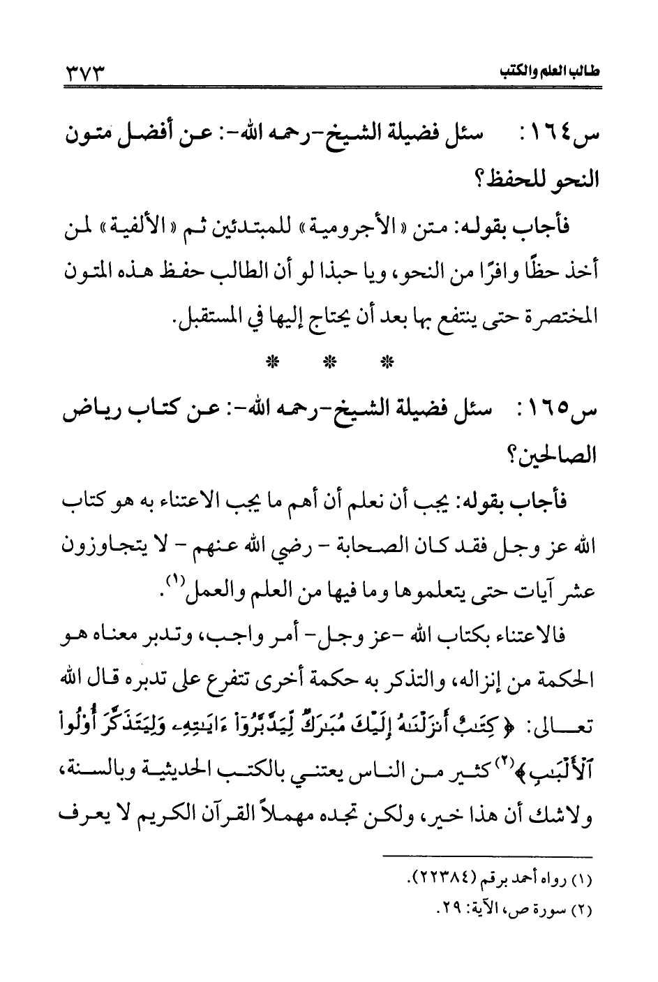 فأجاب بقوله: يجب أن نعلم أن أهم ما يجب الاعتناء به هو كتاب الله عز وجل فقد كان الصحابة- رضي الله عنهم- لا يتجاوزون عشر آيات حتى يتعلموها وما فيها من العلم والعمل (1) .