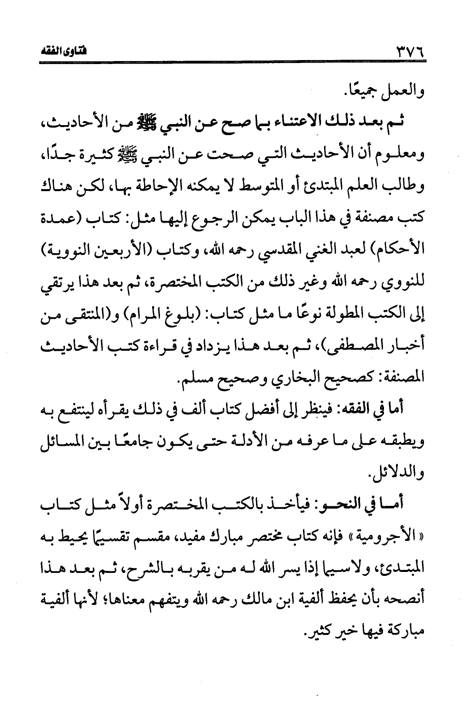 أما في النحو: فيأخذ بالكتب المختصرة أولاً مثل كتاب (الأجرومية) فإنه كتاب مختصر مبارك مفيد، مقسم تقسيمًا يحيط به المبتدئ، ولاسيما إذا يسر الله له من يقربه بالشرح، ثم بعد هذا أنصحه بأن يحفظ ألفية ابن مالك رحمه الله ويتفهم معناها؛ لأنها ألفية مباركة فيها خير كثير.