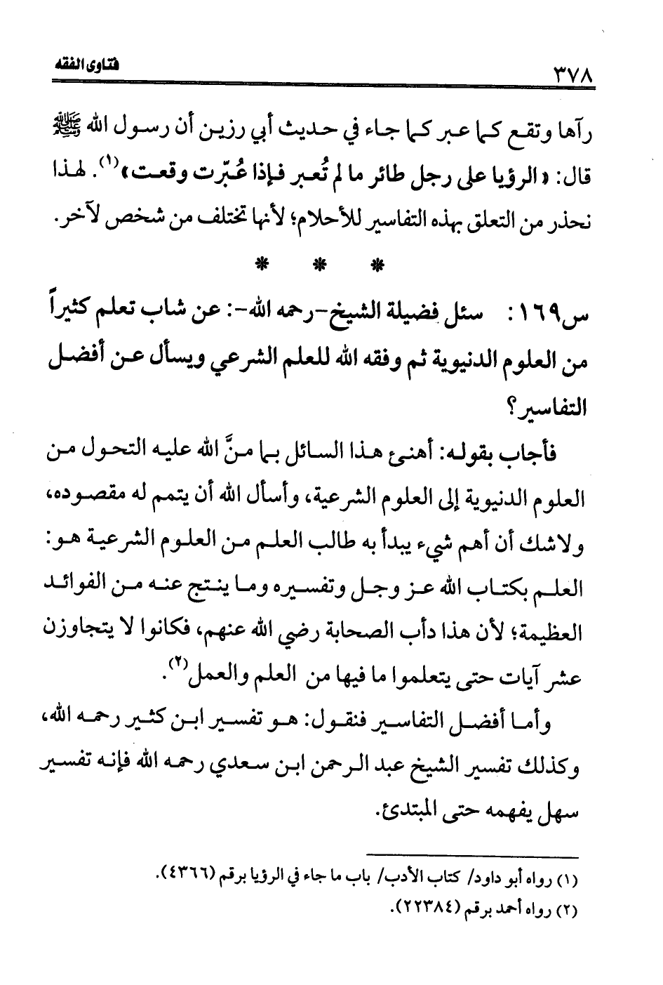 س 169: سئل فضيلة الشيخ- رحمه الله-: عن شاب تعلم كثيراً من العلوم الدنيوية ثم وفقه الله للعلم الشرعي ويسأل عن أفضل التفاسير؟
