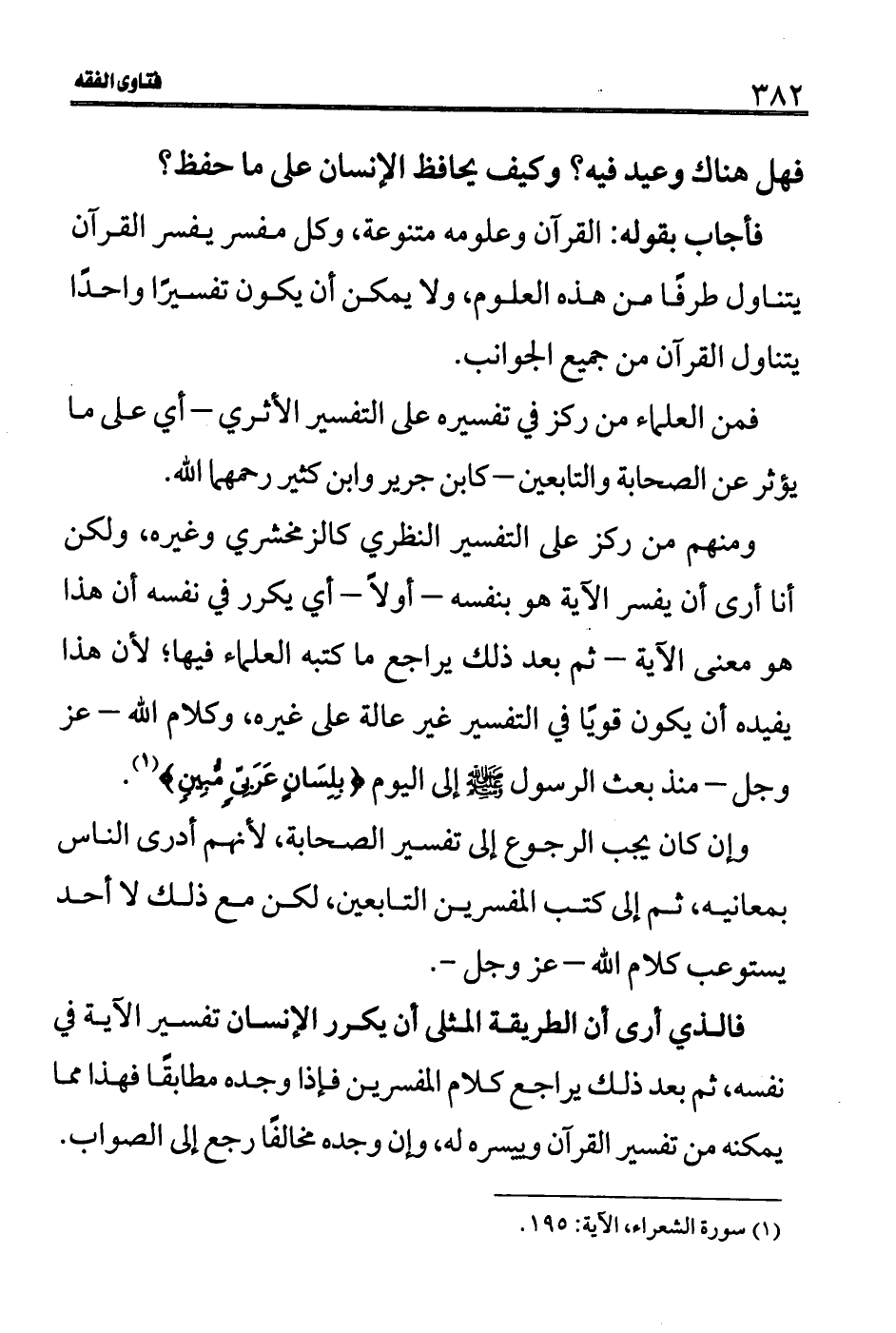 فهل هناك وعيد فيه؟ وكيف يحافظ الإنسان على ما حفظ؟ فأجاب بقوله: القرآن وعلومه متنوعة، وكل مفسر يفسر القرآن يتناول طرفًا من هذه العلوم، ولا يمكن أن يكون تفسيرًا واحدًا