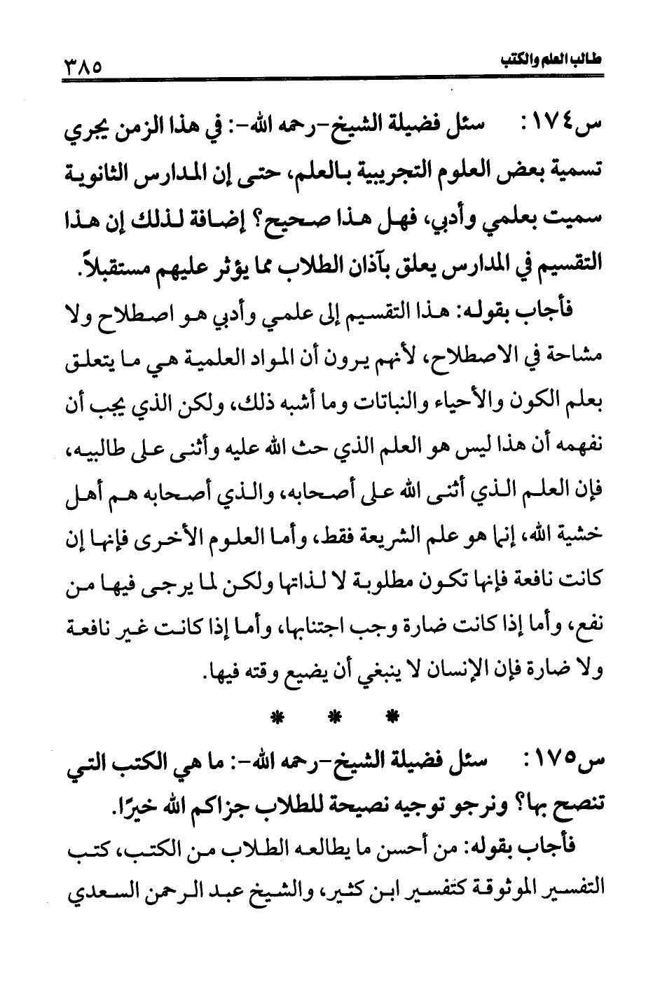 س 174: سئل فضيلة الشيخ- رحمه الله-: في هذا الزمن يجري تسمية بعض العلوم التجريبية بالعلم، حتى إن المدارس الثانوية سميت بعلمي وأدبي، فهل هذا صحيح؟ إضافة لذلك إن هذا