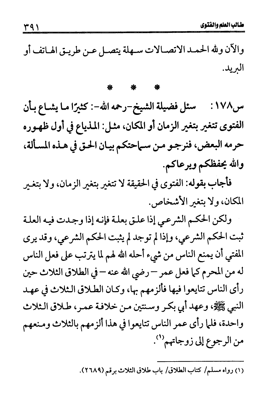 س 178: سئل فضيلة الشيخ- رحمه الله-: كثيرًا ما يشاع بأن الفتوى تتغير بتغير الزمان أو المكان، مثل: المذياع في أول ظهوره حرمه البعض، فنرجو من سماحتكم بيان الحق في هذه المسألة،