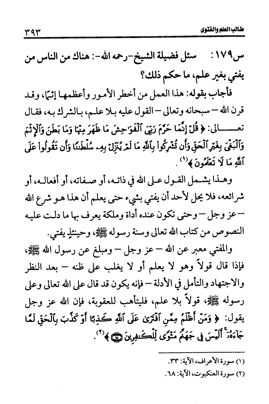 س 179: سئل فضيلة الشيخ- رحمه الله-: هناك من الناس من يفتي بغير علم، ما حكم ذلك؟