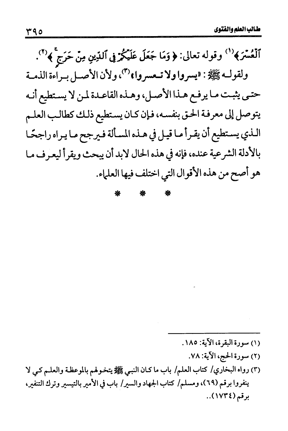 ولقوله - صلى الله عليه وسلم -: "يسروا ولا تعسروا" (3) ، ولأن الأصل براءة الذمة حتى يثبت ما يرفع هذا الأصل، وهذه القاعدة لمن لا يستطيع أنه يتوصل إلى معرفة الحق بنفسه، فإن كان يستطيع ذلك كطالب العلم الذي يستطيع أن يقرأ ما قيل في هذه المسألة فيرجح ما يراه راجحًا