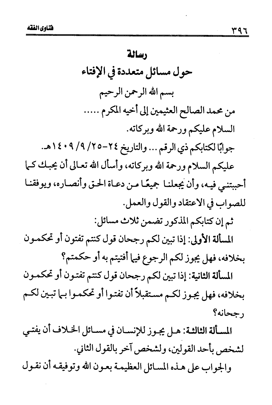 ثم إن كتابكم المذكور تضمن ثلاث مسائل: