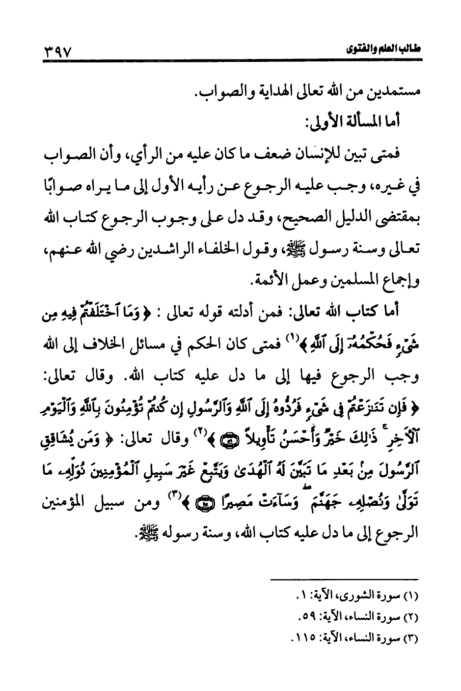 (فَإِنْ تَنَازَعْتُمْ فِي شَيْءٍ فَرُدُّوهُ إِلَى اللَّهِ وَالرَّسُولِ إِنْ كُنْتُمْ تُؤْمِنُونَ بِاللَّهِ وَالْيَوْمِ الْآَخِرِ ذَلِكَ خَيْرٌ وَأَحْسَنُ تَأْوِيلًا (59)) (2) وقال تعالى: (وَمَنْ يُشَاقِقِ الرَّسُولَ مِنْ بَعْدِ مَا تَبَيَّنَ لَهُ الْهُدَى وَيَتَّبِعْ غَيْرَ سَبِيلِ الْمُؤْمِنِينَ نُوَلِّهِ مَا تَوَلَّى وَنُصْلِهِ جَهَنَّمَ وَسَاءَتْ مَصِيرًا (115)) (3) ومن سبيل المؤمنين
