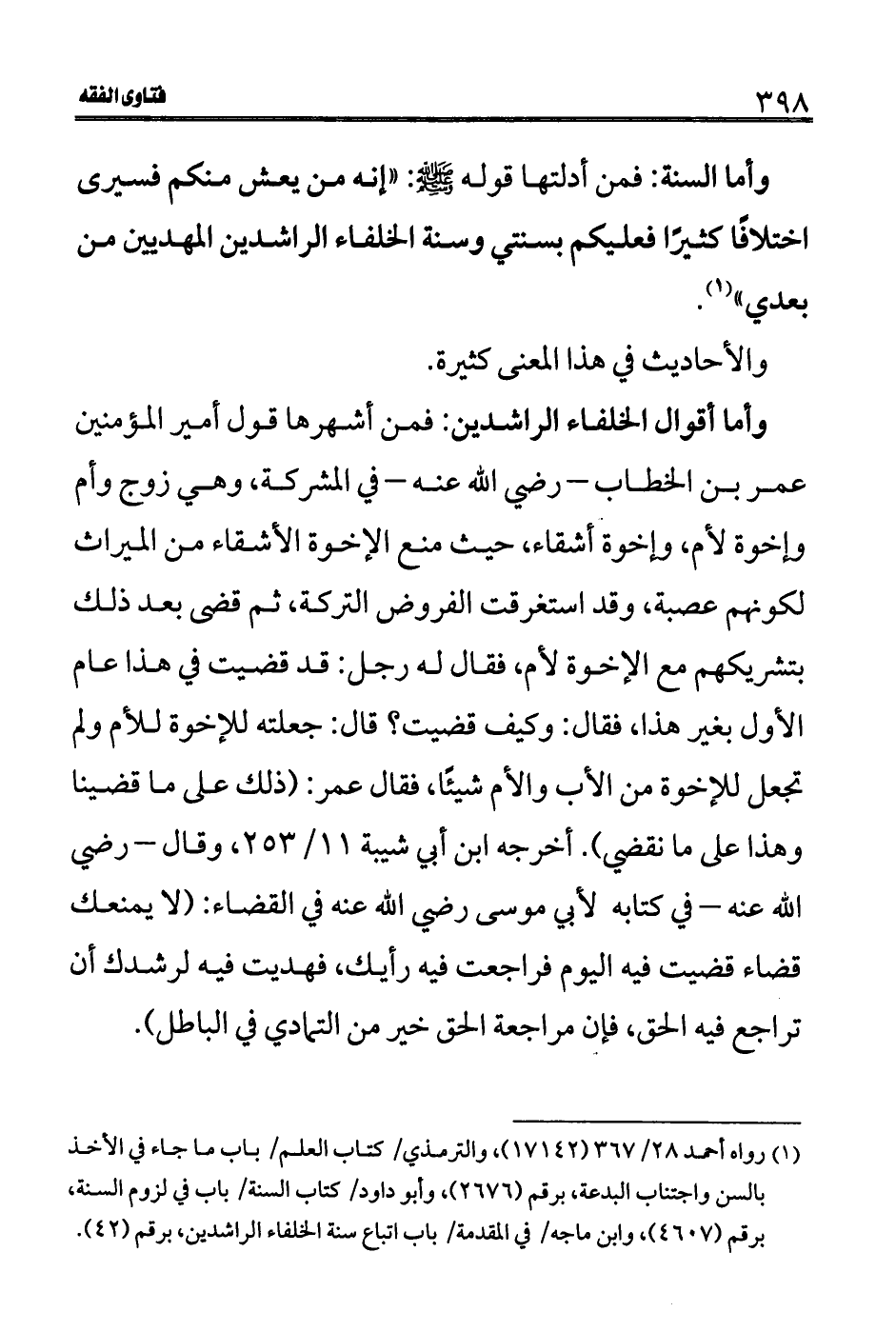 وأما السنة: فمن أدلتها قوله - صلى الله عليه وسلم -: " إنه من يعش منكم فسيرى اختلافًا كثيرًا فعليكم بسنتي وسنة الخلفاء الراشدين المهديين من بعدي " (1) .