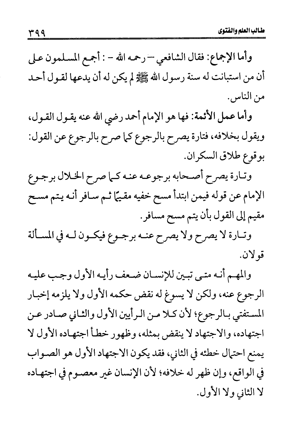 وأما عمل الأئمة: فها هو الإمام أحمد رضي الله عنه يقول القول، ويقول بخلافه، فتارة يصرح بالرجوع كما صرح بالرجوع عن القول: بوقوع طلاق السكران.