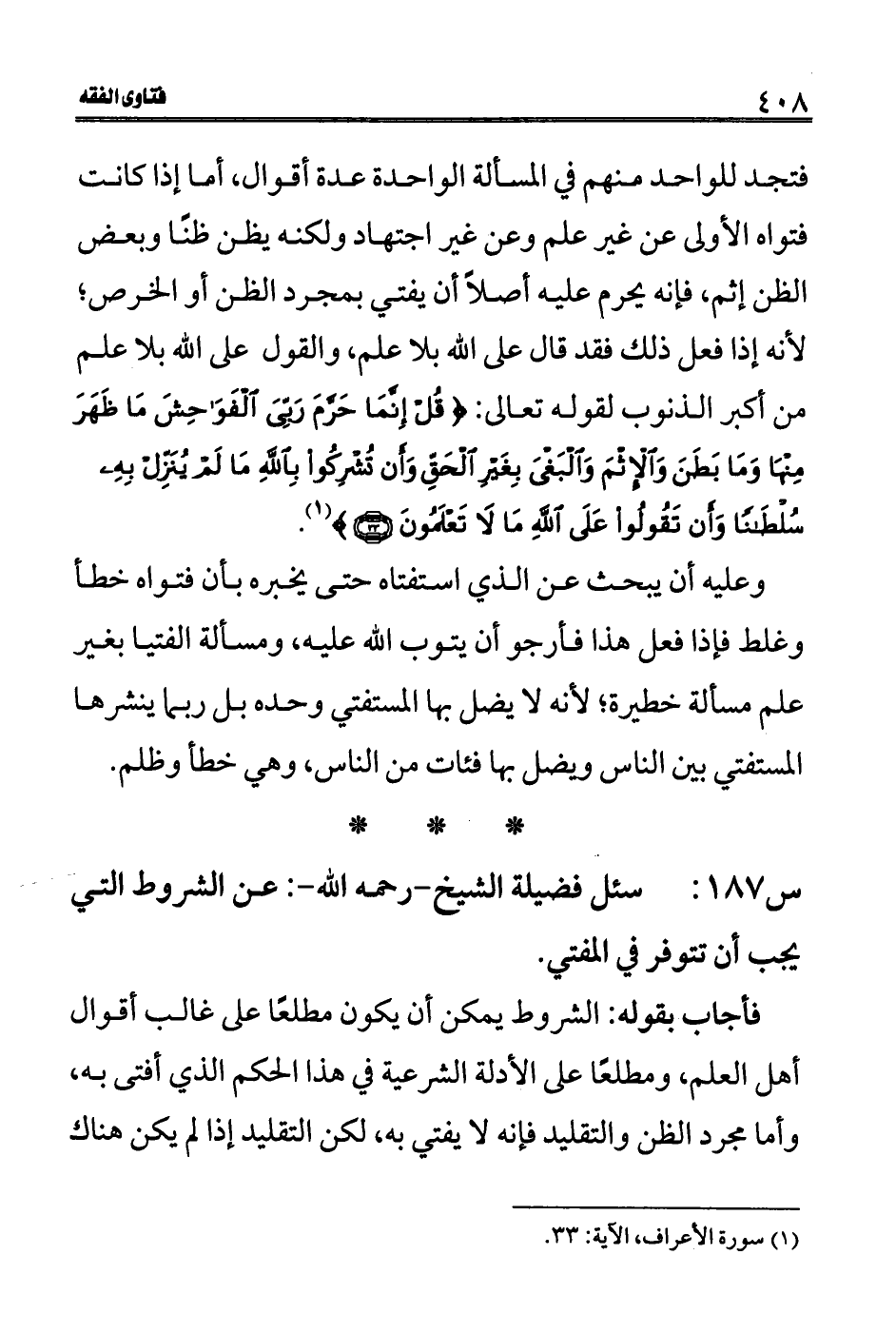 س 187: سئل فضيلة الشيخ- رحمه الله-: عن الشروط التي يجب أن تتوفر في المفتي.