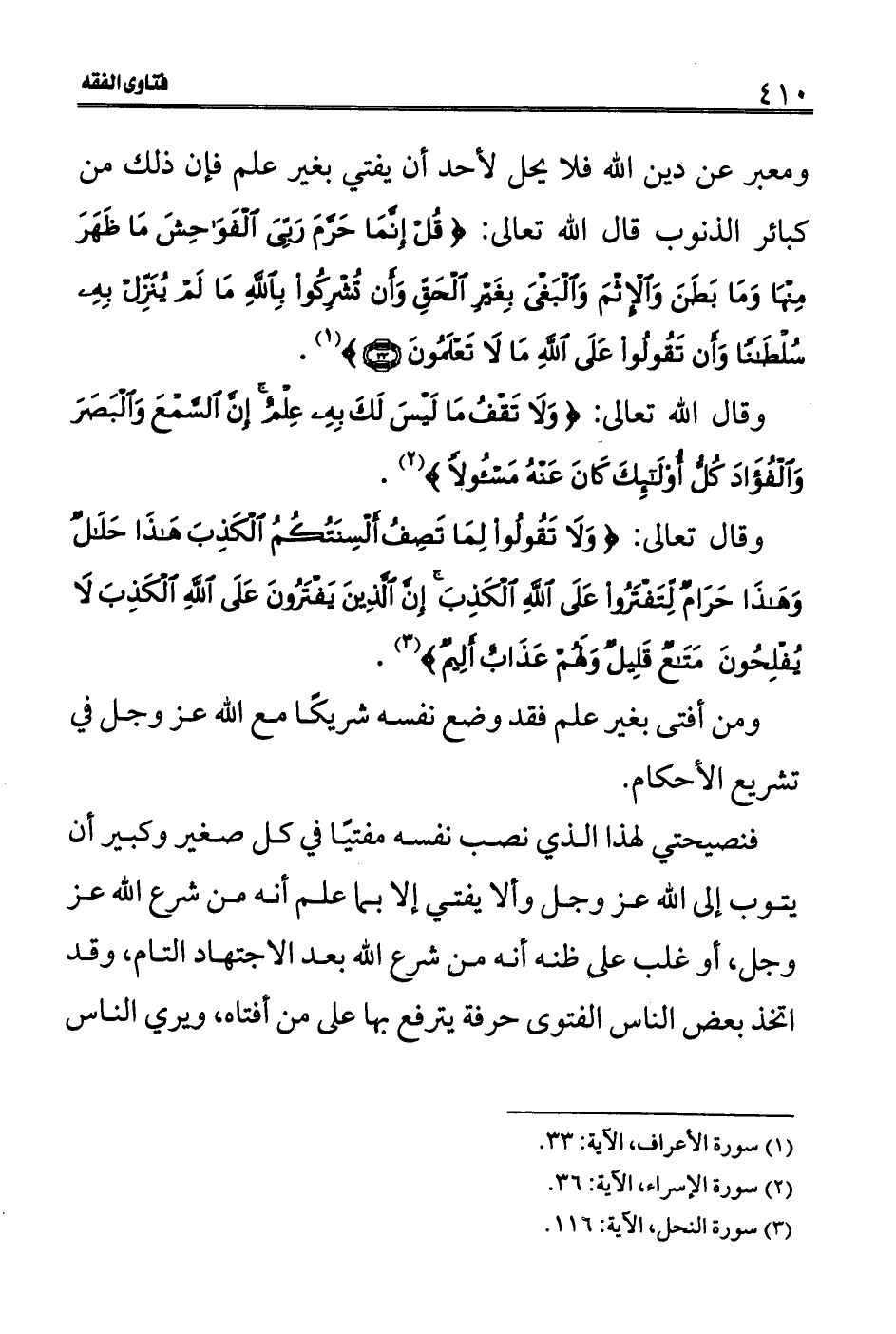 ومعبر عن دين الله فلا يحل لأحد أن يفتي بغير علم فإن ذلك من كبائر الذنوب قال الله تعالى: (قُلْ إِنَّمَا حَرَّمَ رَبِّيَ الْفَوَاحِشَ مَا ظَهَرَ مِنْهَا وَمَا بَطَنَ وَالْأِثْمَ وَالْبَغْيَ بِغَيْرِ الْحَقِّ وَأَنْ تُشْرِكُوا بِاللَّهِ مَا لَمْ يُنَزِّلْ بِهِ سُلْطَاناً وَأَنْ تَقُولُوا عَلَى اللَّهِ مَا لا تَعْلَمُونَ (33) (1) .