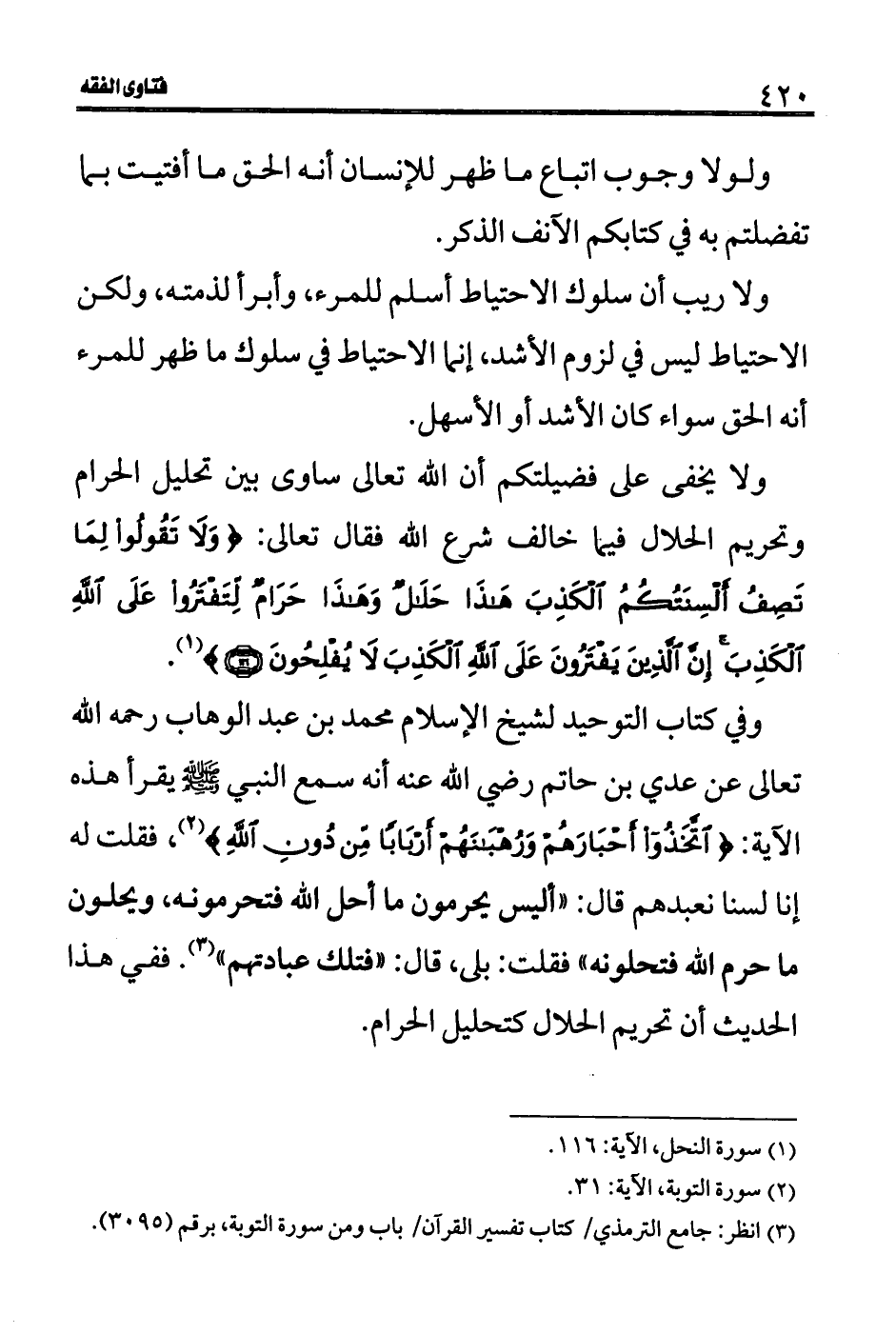 وفي كتاب التوحيد لشيخ الإسلام محمد بن عبد الوهاب رحمه الله تعالى عن عدي بن حاتم رضي الله عنه أنه سمع النبي - صلى الله عليه وسلم - يقرأ هذه الآية: (اتَّخَذُوا أَحْبَارَهُمْ وَرُهْبَانَهُمْ أَرْبَاباً مِنْ دُونِ اللَّهِ) (2) ، فقلت له إنا لسنا نعبدهم قال: "أليس يحرمون ما أحل الله فتحرمونه، ويحلون