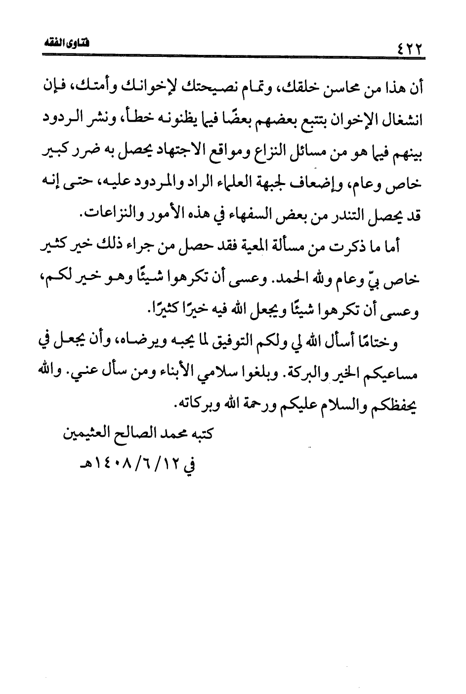 أن هذا من محاسن خلقك، وتمام نصيحتك لإخوانك وأمتك، فإن انشغال الإخوان بتتبع بعضهم بعضًا فيما يظنونه خطأ، ونشر الردود بينهم فيما هو من مسائل النزاع ومواقع الاجتهاد يحصل به ضرر كبير خاص وعام، وإضعاف لجبهة العلماء الراد والمردود عليه، حتى إنه قد يحصل التندر من بعض السفهاء في هذه الأمور والنزاعات.