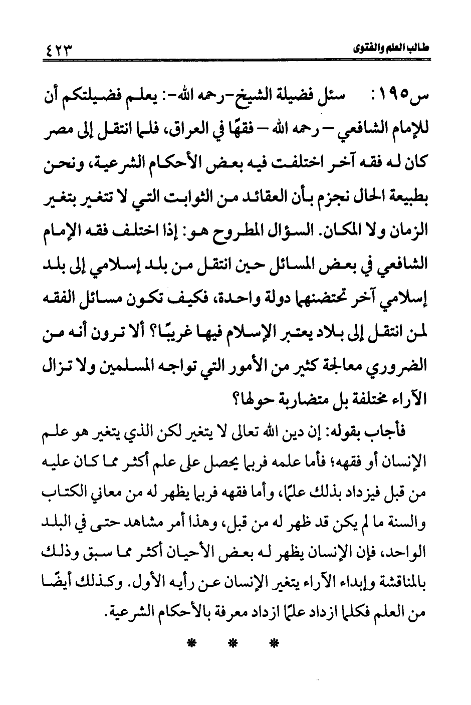س 195: سئل فضيلة الشيخ- رحمه الله-: يعلم فضيلتكم أن للإمام الشافعي- رحمه الله- فقهًا في العراق، فلما انتقل إلى مصر كان له فقه آخر اختلفت فيه بعض الأحكام الشرعية، ونحن