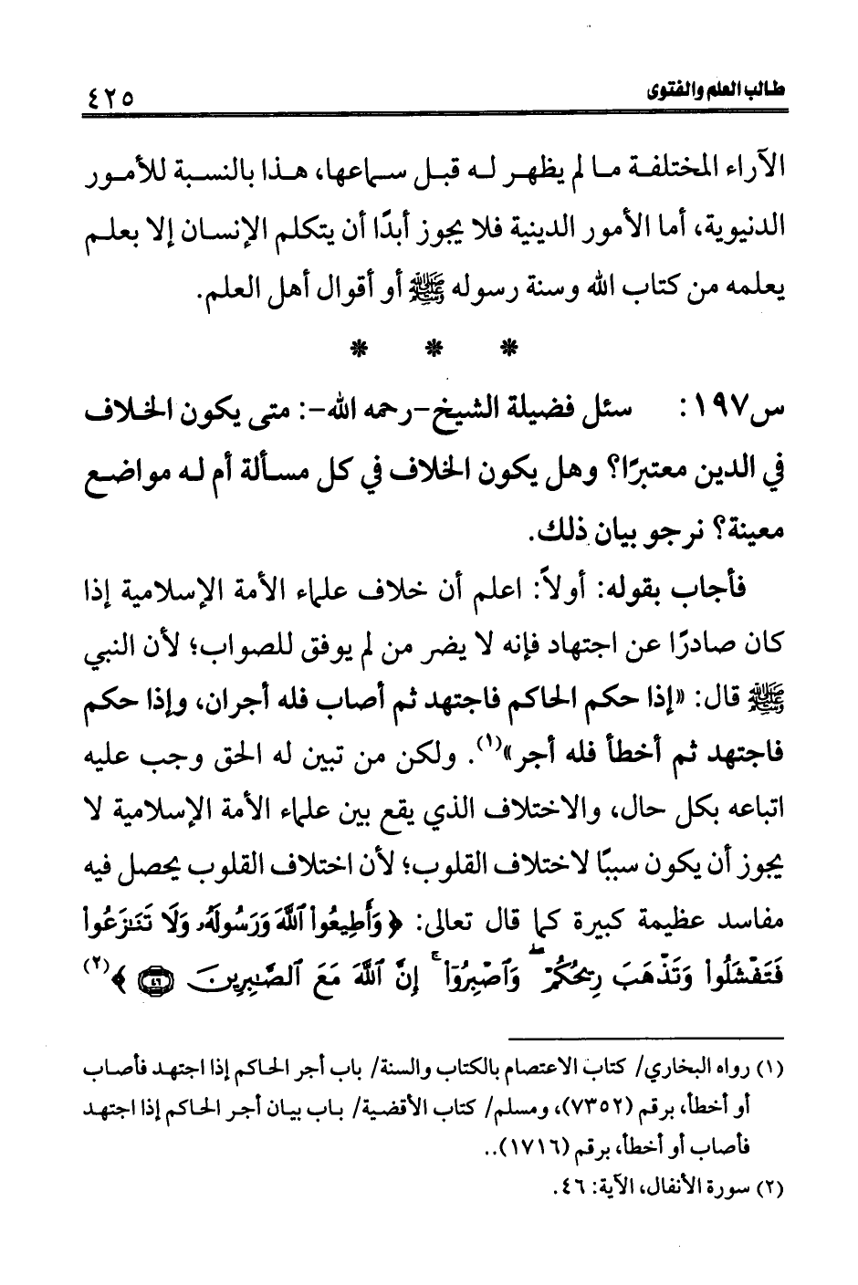 س 197: سئل فضيلة الشيخ- رحمه الله-: متى يكون الخلاف في الدين معتبرًا؟ وهل يكون الخلاف في كل مسألة أم له مواضع معينة؟ نرجو بيان ذلك.