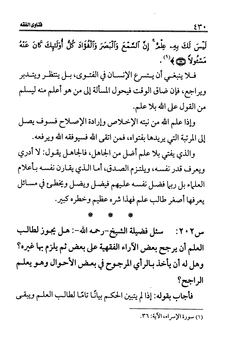 لَيْسَ لَكَ بِهِ عِلْمٌ إِنَّ السَّمْعَ وَالْبَصَرَ وَالْفُؤَادَ كُلُّ أُولَئِكَ كَانَ عَنْهُ مَسْئُولًا (36)) (1) .