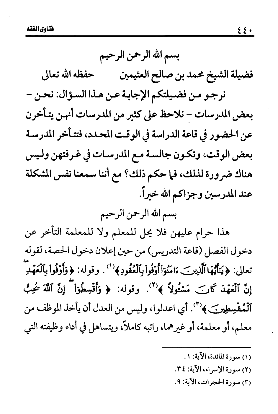 هذا حرام عليهن فلا يحل للمعلم ولا للمعلمة التأخر عن دخول الفصل (قاعة التدريس) من حين إعلان دخول الحصة، لقوله تعالى: (يَا أَيُّهَا الَّذِينَ آمَنُوا أَوْفُوا بِالْعُقُودِ) (1) . وقوله: (وَأَوْفُوا بِالْعَهْدِ إِنَّ الْعَهْدَ كَانَ مَسْؤُولاً) (2) وقوله: (وَأَقْسِطُوا إِنَّ اللَّهَ يُحِبُّ الْمُقْسِطِينَ) (3) . أي اعدلوا، وليس من العدل أن يأخذ الموظف من معلم، أو معلمة، أو غيرهما، راتبه كاملاً، ويتساهل في أداء وظيفته التي