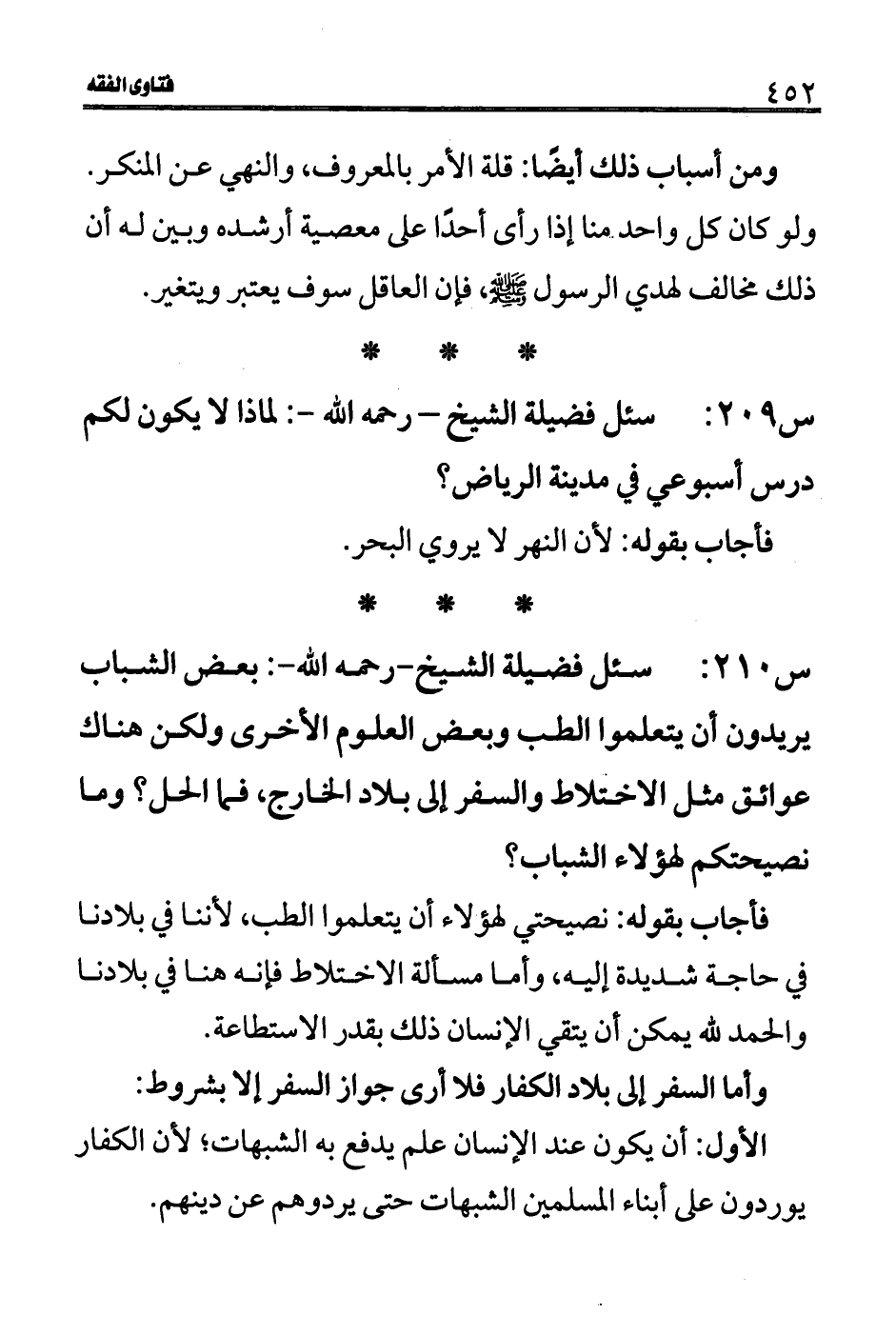 س 209: سئل فضيلة الشيخ- رحمه الله-: لماذا لا يكون لكم درس أسبوعي في مدينة الرياض؟