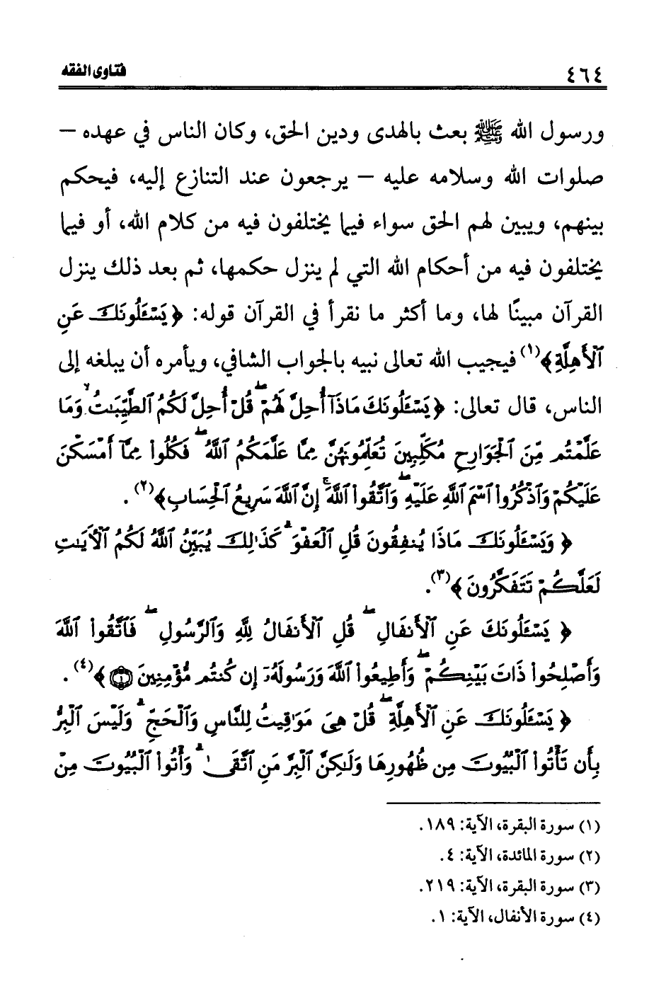 القرآن مبينًا لها، وما أكثر ما نقرأ في القرآن قوله: (يَسْأَلونَكَ عَنِ الْأَهِلَّةِ) (1) فيجيب الله تعالى نبيه بالجواب الشافي، ويأمره أن يبلغه إلى الناس، قال تعالى: (يَسْأَلونَكَ مَاذَا أُحِلَّ لَهُمْ قُلْ أُحِلَّ لَكُمُ الطَّيِّبَاتُ وَمَا عَلَّمْتُمْ مِنَ الْجَوَارِحِ مُكَلِّبِينَ تُعَلِّمُونَهُنَّ مِمَّا عَلَّمَكُمُ اللَّهُ فَكُلُوا مِمَّا أَمْسَكْنَ عَلَيْكُمْ وَاذْكُرُوا اسْمَ اللَّهِ عَلَيْهِ وَاتَّقُوا اللَّهَ إِنَّ اللَّهَ سَرِيعُ الْحِسَابِ) (2) .
