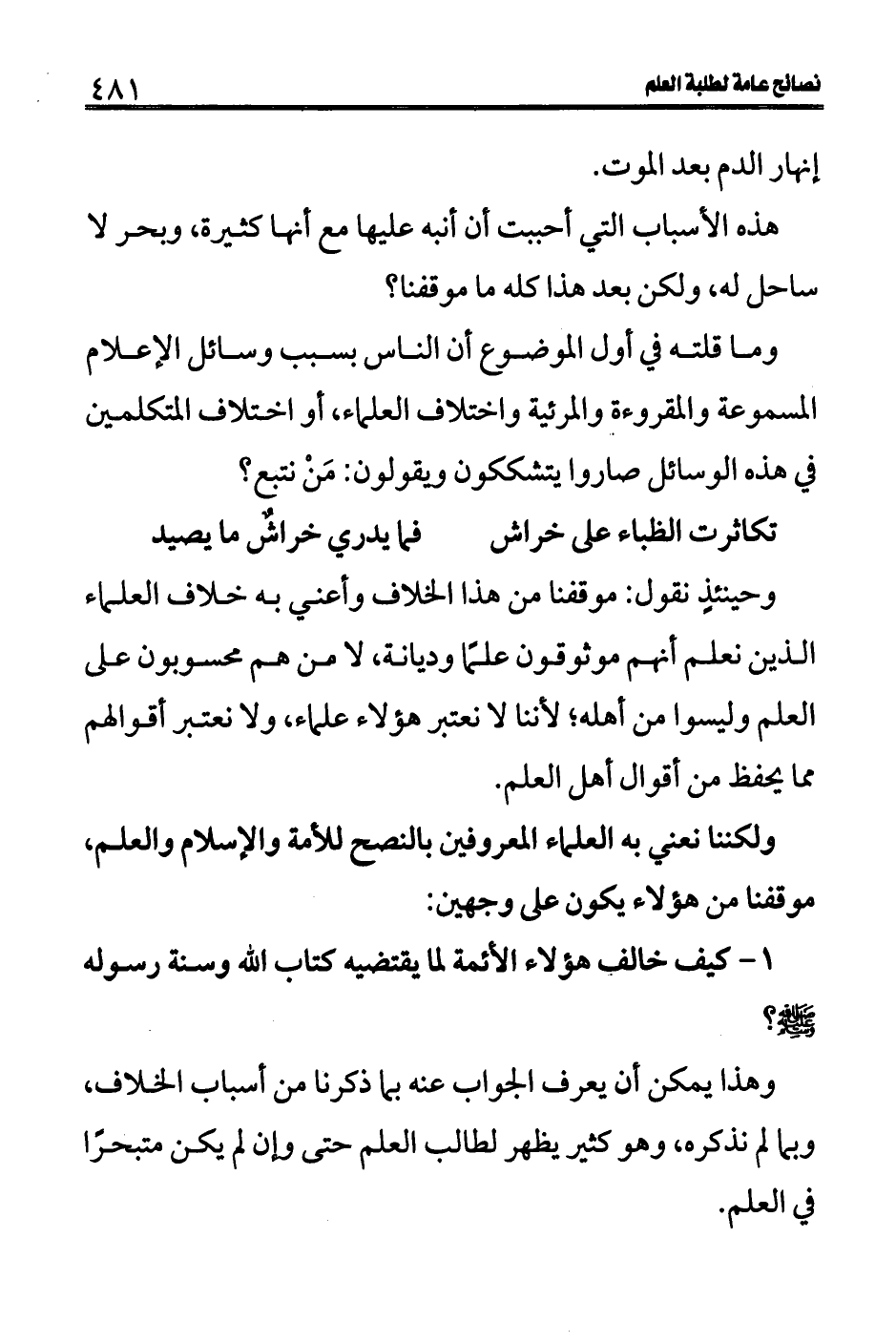 تكاثرت الظباء على خراش فما يدري خراشٌ ما يصيد وحينئذٍ نقول: موقفنا من هذا الخلاف وأعني به خلاف العلماء الذين نعلم أنهم موثوقون علمًا وديانة، لا من هم محسوبون على العلم وليسوا من أهله؛ لأننا لا نعتبر هؤلاء علماء، ولا نعتبر أقوالهم مما يحفظ من أقوال أهل العلم.
