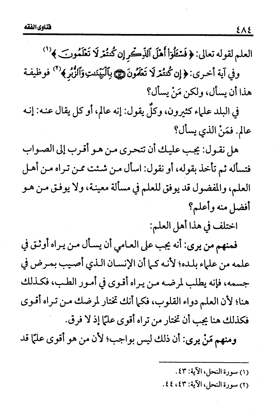 العلم لقوله تعالى: (فَاسْأَلوا أَهْلَ الذِّكْرِ إِنْ كُنْتُمْ لا تَعْلَمُونَ) (1) وفي آية أخرى: (إِنْ كُنْتُمْ لا تَعْلَمُونَ (43) بِالْبَيِّنَاتِ وَالزُّبُرِ) (2) فوظيفة هذا أن يسأل، ولكن مَنْ يسأل؟