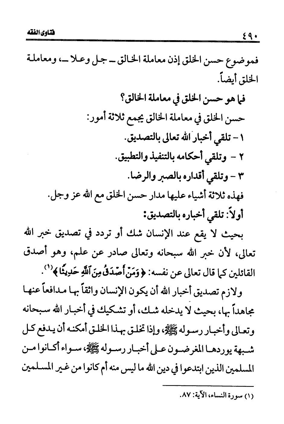 حسن الخلق في معاملة الخالق يجمع ثلاثة أمور: