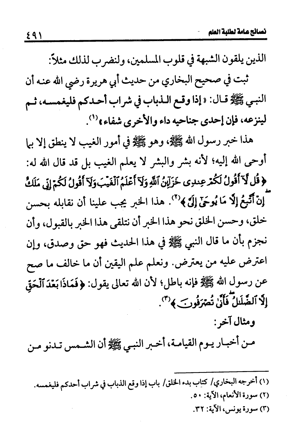 (1) أخرجه البخاري/كتاب بدء الخلق/باب إذا وقع الذباب في شراب أحدكم فليغمسه.