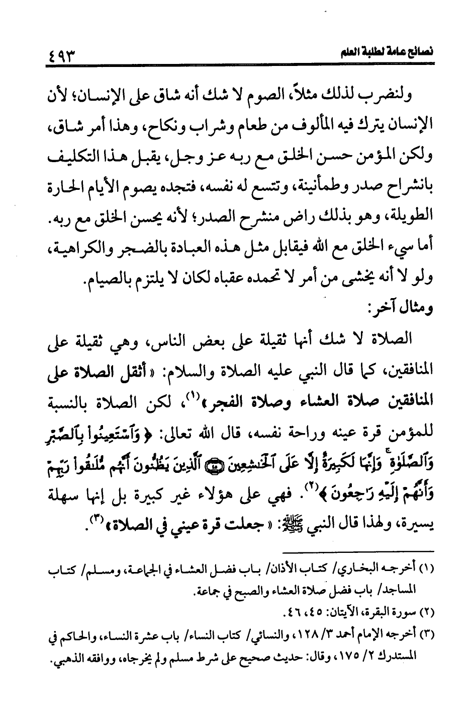 للمؤمن قرة عينه وراحة نفسه، قال الله تعالى: (وَاسْتَعِينُوا بِالصَّبْرِ وَالصَّلَاةِ وَإِنَّهَا لَكَبِيرَةٌ إِلَّا عَلَى الْخَاشِعِينَ (45) الَّذِينَ يَظُنُّونَ أَنَّهُمْ مُلَاقُو رَبِّهِمْ وَأَنَّهُمْ إِلَيْهِ رَاجِعُونَ) (2) . فهي على هؤلاء غير كبيرة بل أنها سهلة يسيرة، ولهذا قال النبي - صلى الله عليه وسلم -: "جعلت قرة عيني في الصلاة" (3) .