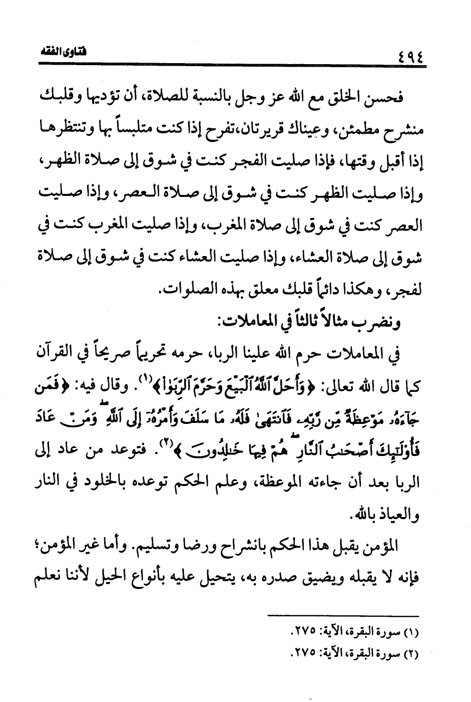 في المعاملات حرم الله علينا الربا، حرمه تحريماً صريحاً في القرآن كما قال الله تعالى: (وَأَحَلَّ اللَّهُ الْبَيْعَ وَحَرَّمَ الرِّبا) (1) . وقال فيه: (فَمَنْ جَاءَهُ مَوْعِظَةٌ مِنْ رَبِّهِ فَانْتَهَى فَلَهُ مَا سَلَفَ وَأَمْرُهُ إِلَى اللَّهِ وَمَنْ عَادَ فَأُولَئِكَ أَصْحَابُ النَّارِ هُمْ فِيهَا خَالِدُونَ) (2) . فتوعد من عاد إلى الربا بعد أن جاءته الموعظة، وعلم الحكم توعده بالخلود في النار والعياذ بالله.