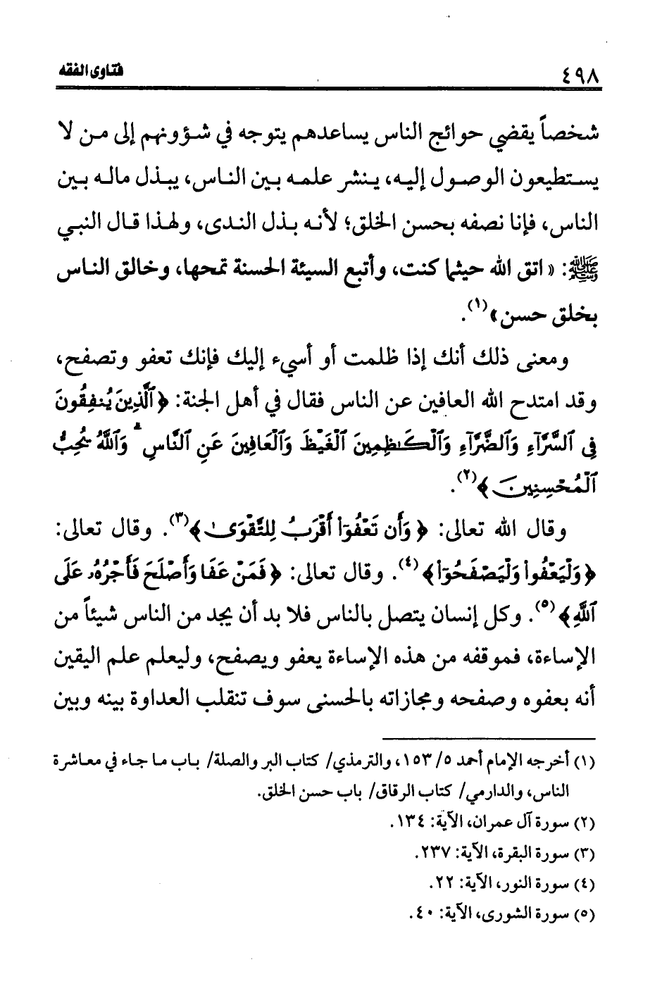 وقال الله تعالى: (وَأَنْ تَعْفُوا أَقْرَبُ لِلتَّقْوَى) (3) . وقال تعالى: (وَلْيَعْفُوا وَلْيَصْفَحُوا) (4) . وقال تعالى: (فَمَنْ عَفَا وَأَصْلَحَ فَأَجْرُهُ عَلَى اللَّهِ) (5) . وكل إنسان يتصل بالناس فلا بد أن يجد من الناس شيئاً من الإساءة، فموقفه من هذه الإساءة يعفو ويصفح، وليعلم علم اليقين أنه بعفوه وصفحه ومجازاته بالحسنى سوف تنقلب العداوة بينه وبين