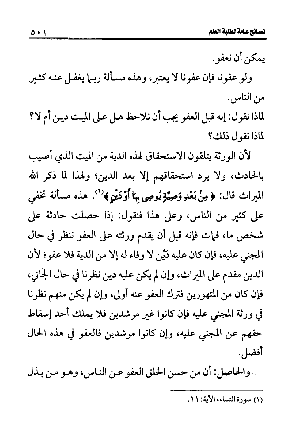 لأن الورثة يتلقون الاستحقاق لهذه الدية من الميت الذي أصيب بالحادث، ولا يرد استحقاقهم إلا بعد الدين؛ ولهذا لما ذكر الله الميراث قال: (مِنْ بَعْدِ وَصِيَّةٍ تُوصُونَ بِهَا أَوْ دَيْنٍ) (1) . هذه مسألة تخفي على كثير من الناس، وعلى هذا فنقول: إذا حصلت حادثة على شخص ما، فمات فإنه قبل أن يقدم ورثته على العفو ننظر في حال المجني عليه، فإن كان عليه دَيْن لا وفاء له إلا من الدية فلا عفو؛ لأن الدين مقدم على الميراث، وإن لم يكن عليه دين نظرنا في حال الجاني، فإن كان من المتهورين فترك العفو عنه أولى، وإن لم يكن منهم نظرنا في ورثة المجني عليه فإن كانوا غير مرشدين فلا يملك أحد إسقاط حقهم عن المجني عليه، وإن كانوا مرشدين فالعفو في هذه الحال أفضل.