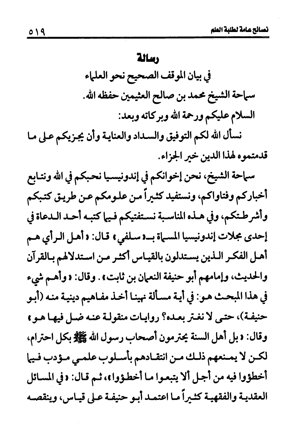 سماحة الشيخ محمد بن صالح العثيمين حفظه الله.